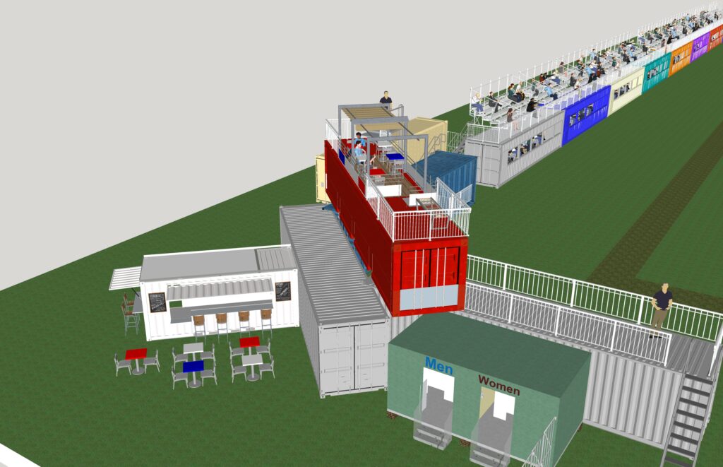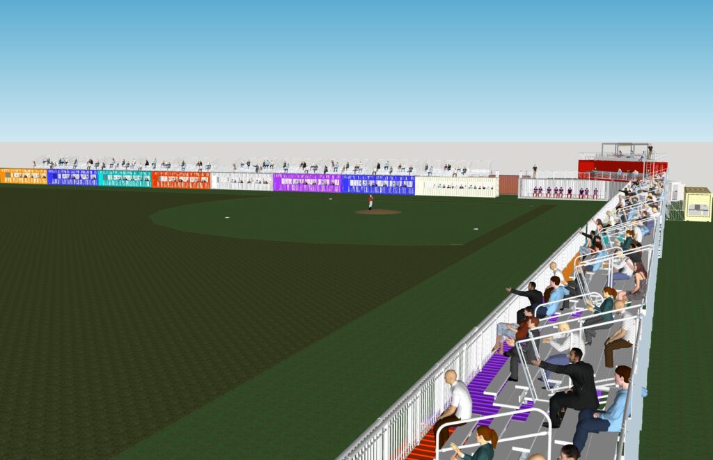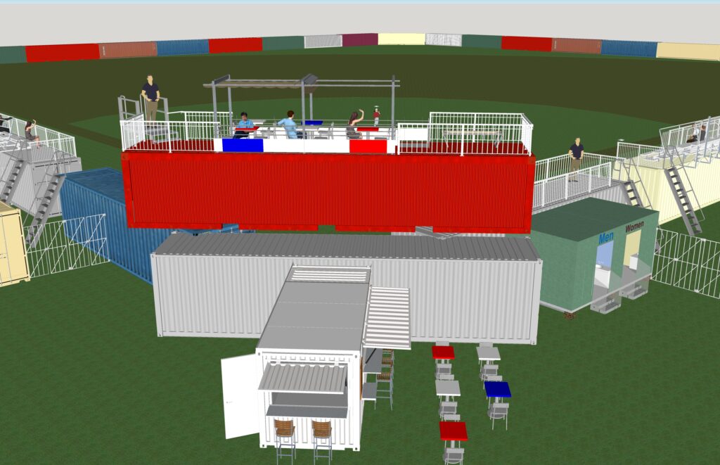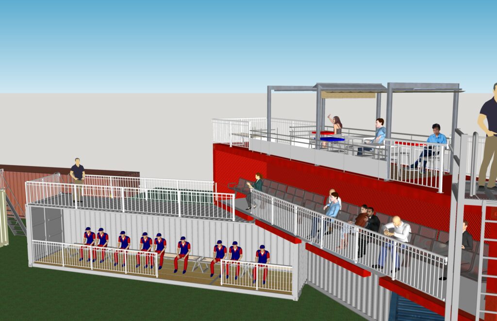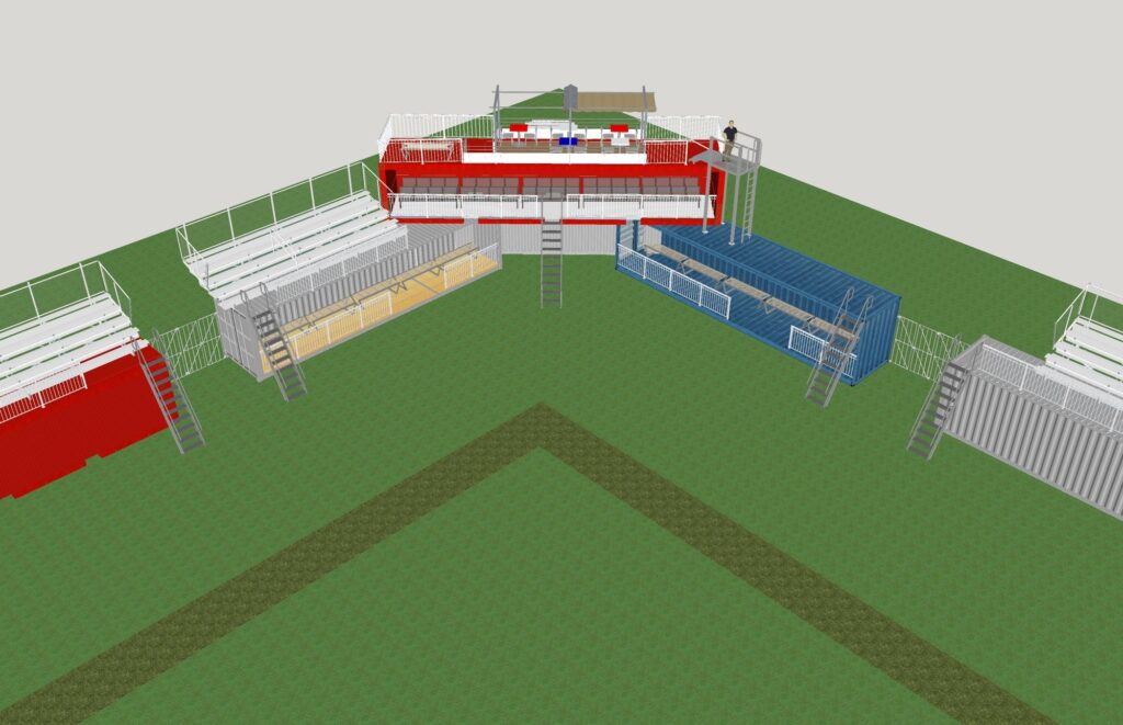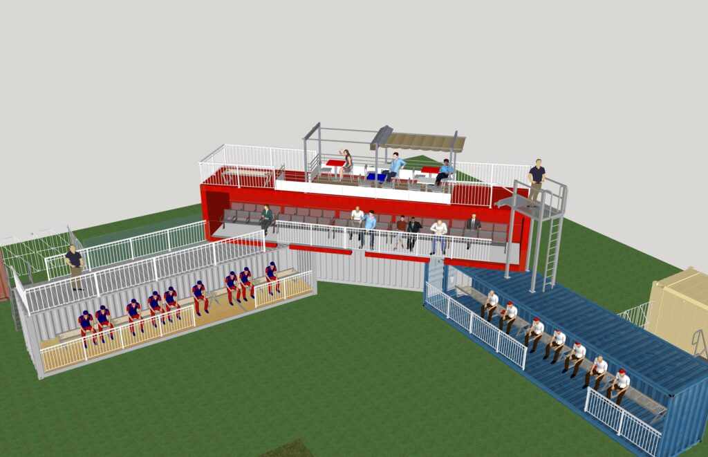 A portable stadium can be built using shipping containers, providing a cost-effective solution.